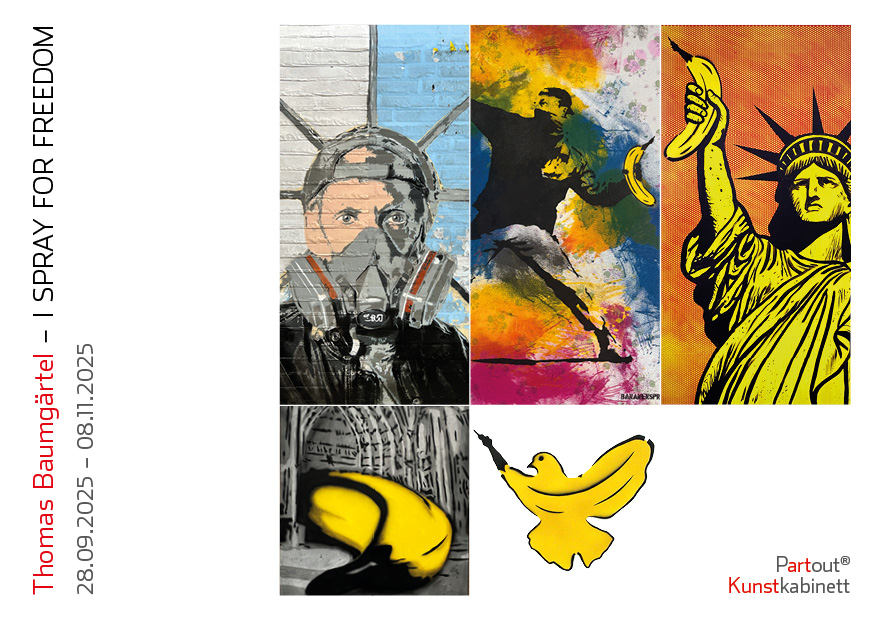 Thomas Baumgärtels Bekenntnis I SPRAY FOR FREEDOM ist zentrale Botschaft seiner Kunst. Seit fast 40 Jahren sprayt der Streetart-Künstler sein Bananen-Markenzeichen als Symbol für die Freiheit von Kunst. Was kann Kunst, was darf Kunst? Thomas Baumgärtel beantwortet diese Fragen in Stencils, als Graffiti oder Murals im Außenraum, auf Papier, Leinwand, Plakatwand in Spray- und Maltechnik oder skulptural für den Innenraum. Baumgärtels Sujets sind gezielte Statements. Immer geht es um Freiheit. War es anfangs vor allem die Freiheit der Kunst, so kamen schnell Themen der Weltpolitik hinzu: Menschenrechte, Friedenspolitik, Klimaschutz u.a. Thomas Baumgärtel komponiert pointierte Bilder von bitterem Ernst einerseits, mehrdeutig und voller Witz andererseits. Bei absolutem Einsatz für seine Überzeugung vergisst der Künstler eines nie: die Freiheit der oder des Andersdenkenden.