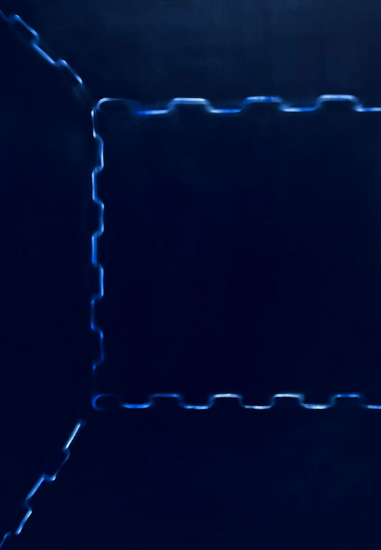 Konstant ist allein die Dominanz der Farbe Blau. „Blau ist mein Vokabular und mir sind noch nie die Worte ausgegangen“,1 sagt Jovita Majewski, die eine genaue gesellschaftspolitische Beobachterin ist. Blau hat in der Kunst eine wechselvolle Bedeutungsgeschichte. Seit der Erfindung des Ägyptischblau 2500 v. Chr. erfährt die Farbe in nahezu jeder Kunstepoche eine besondere Wertschätzung. Exemplarisch seien genannt Werke von Hilma af Klint (1862-1944), Louise Bourgeois (1911-2010), das Yves Klein-Blau, 1960 und das leuchtende Blau der breitgefächerten Farbpalette von Katharina Fritsch, das z. B. monochrome Skulpturen „Hahn, 2013“, „Sarg, 2016“, „Erdbeere, 2017“ oder „Zwei Männer 2019“ bestimmt.
