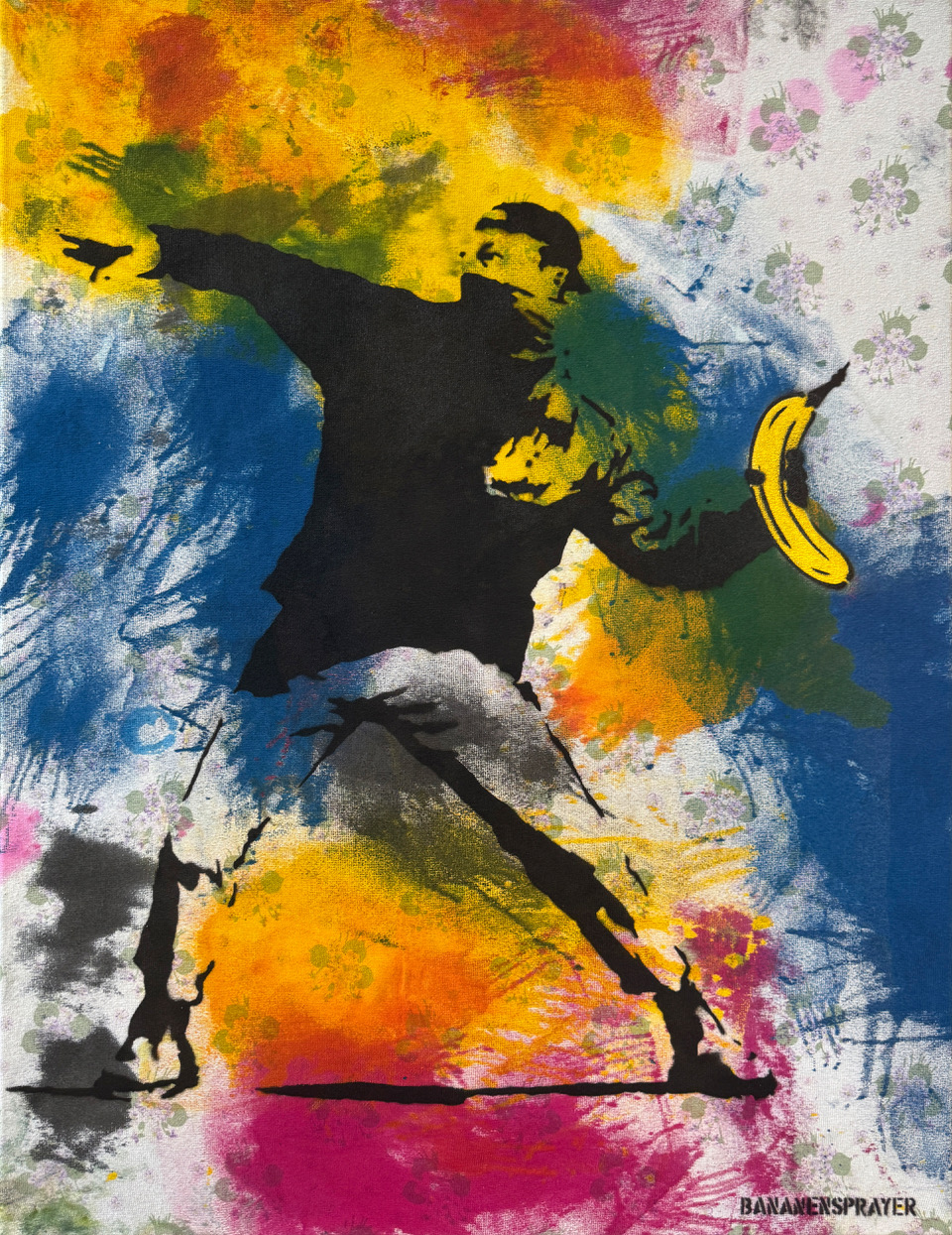 Bekannt ist Thomas Baumgärtel als „Bananensprayer“. Mit seinem Markenzeichen, der Spraybanane, markiert der Künstler seit 1985 besondere Kunstorte weltweit. Die Spraybanane ist somit zu einem zwar inoffiziellen, doch am Kunstmarkt äußerst etabliertem Gütesiegel für ausgewählte Kunstorte und dort präsentierter Kunst avanciert. Doch Thomas Baumgärtel ist mehr als „nur“ der Bananensprayer. Sein Œuvre reicht von der Malerei, Zeichnung, Druckgrafik, Fotocollage bis hin zu den Spraybildern, der Übersprühung „Alter Meister“-Bilder, Fotos und der Fertigung von Spray-Objekten. Zudem ist Thomas Baumgärtel der bekannteste Street-Artist Deutschlands. Die subversiven oft nächtlichen Sprayaktionen der Anfangsjahre sind längst zu großen Happenings geworden. Kunst muss für Thomas Baumgärtel in der Welt Position beziehen. So setzt der Künstler seine Spraybanane nicht nur für die Kunst, sondern auch im Kampf für eine bessere Gesellschaft, für eine faire Wirtschaftspolitik, für den Weltfrieden ein. Mit ungeheurer Symbolkraft in der Bild- und der Titelgebung fertigt er Karikaturen über Despoten wie Trump, Erdogan und Putin und sprüht die Darstellung überdimensional auf Wände im öffentlichen Raum. Jüngstes Beispiel ist die Arbeit „Put in prison“, die den Diktator und Kriegstreiber Putin in Häftlingskluft mit Bananenmütze auf dem Kopf auf einer Gebäudefassade in Köln zeigt. Der Künstler nutzt seine Bekanntheit und sein Markenzeichen immer wieder aktiv so z.B. zur Unterstützung gesundheitspolitischer Projekte wie mit der Versteigerung seiner großen Corona- Impfbanane zur Förderung der Impfkampagne oder der Teilnahme an Ukraine-Friedensdemos mit eigens dafür geschaffenen Bananen-Objekten, die zum Nachdenken und Handeln aufrufen. Kunst hat eine gesellschaftspolitische Botschaft und Bedeutung – dafür stehen Thomas Baumgärtel und sein Markenzeichen, die Spraybanane in all ihren Facetten.